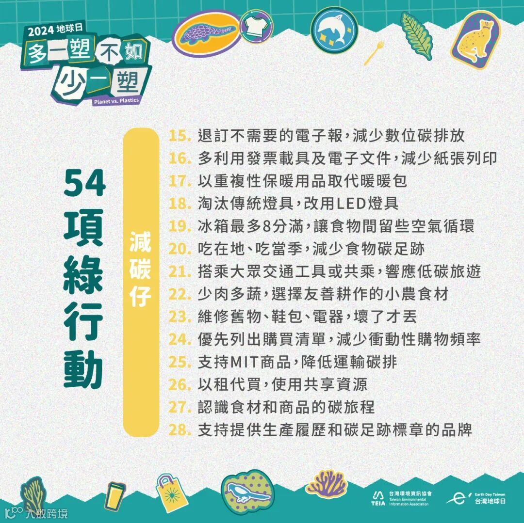 将54项绿行动分为:减塑、减碳、节约、知识 四个种类,让绿行动更加具体行动化。