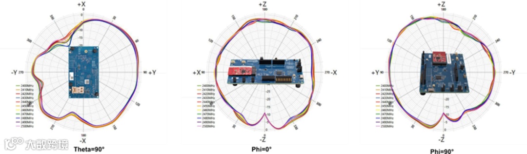 如图1所示,我们测量了CYW920829M2EVK-02套件的天线增益,并确定了该套件在哪个方向上辐射强度最大。不同的蓝牙天线的最佳辐射方向不同,这影响了我们在测试低功耗长距离性能时选择评估板的朝向。由于天线发射时的指向性与接收时的指向性相同,考虑到天线的最大增益,我们将两块评估板放置在面对面方向。