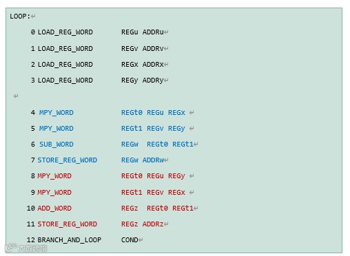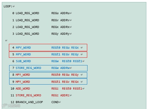 上列代码由PPU处理,可以将第4和第5行的乘法运算分别分配给两个浮点运算器同时处理,如下红框所示。而在下个指令周期内,第7,8,9行的指令可以分配给三个部件同时处理,如下蓝框所示。从而将原先需要12条指令周期运行的代码缩短到9条(12-1-2=9)指令周期,提高执行效率。