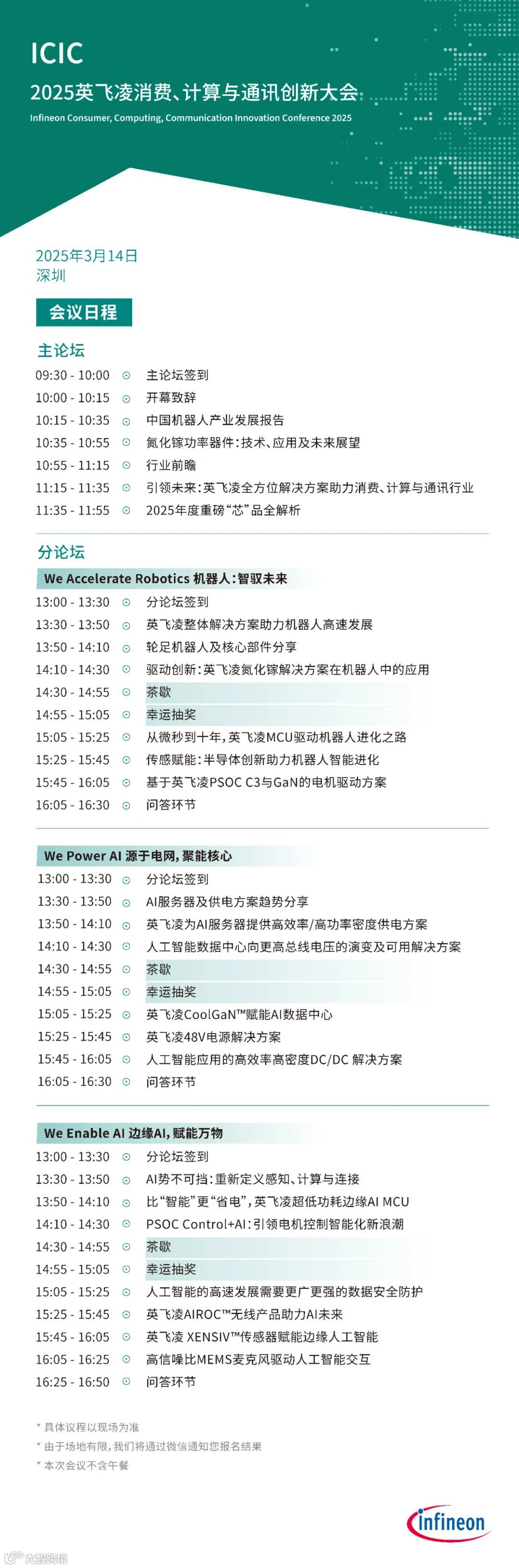 英飞凌在电源、MCU、无线连接和传感器等方面不断深耕,此次峰会将为您带来最新产品、方案及应用的深度解读。无论您是寻求技术升级,还是探索新的业务领域,都能在这里找到全方位的解决方案,为您的事业发展注入强劲动力。