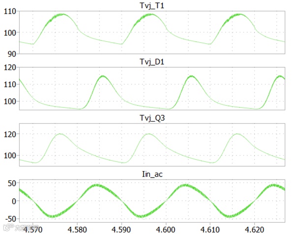 如图9和图10所示,快管T1/D1属于高频硬开关,慢管Q3只是工频导通。所以,快管的器件功率损耗包含开关损耗和导通损耗,而慢管的器件功率损耗只有导通损耗。再加上器件自身的瞬态热阻Zthjc,以及器件外围的热阻与水温等,就可以得到功率器件的结温Tvj波动,如图11所示: