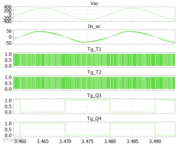 图9:电网电压(V)和电流(A)及其驱动信号(T1/T2为快管、Q3/Q4为慢管)