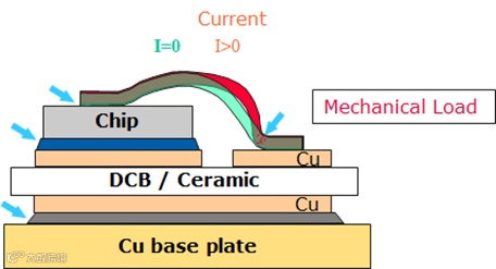 功率循环(PC)寿命的本质,其实是功率器件内的不同封装材料,在温度变化时,由于自身CTE不匹配而产生的彼此机械应力与疲劳损伤,进而产生材料间的分离和功率器件电气失效等现象,如绑定线与DCB分离、绑定线与芯片上表面分开、芯片与DCB焊料分层、DCB与铜基板之间焊料退化等等,如图1。
