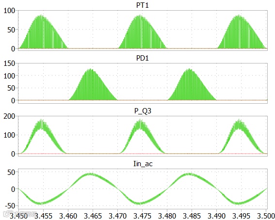 图10:快管(T1/D1)和慢管(Q3)损耗(W)波形与电网电流(A)的波形