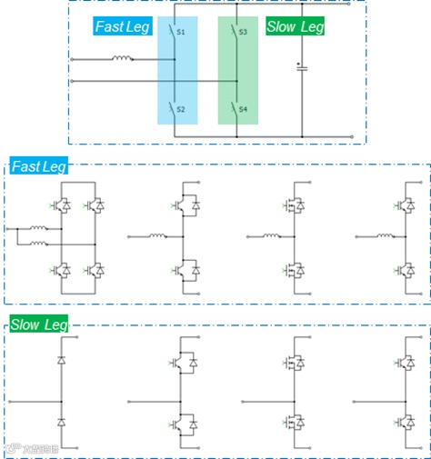 如图7,在单/三相电网兼容的11kW OBC PFC中,基本以1200V SiC MOEFET单管的方案为主,在三相电网充放电时,以三相全桥B6拓扑运行,在单相电网充放电或者V2L时,可选其中一组桥臂作为慢管工作,其他桥臂交错或并联作为快管工作。