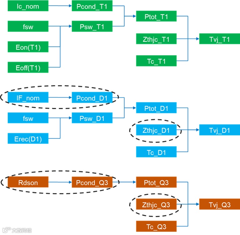 由图11,无论快管还是慢管,都存在50Hz的结温Tvj波动。结合前面的仿真分析可知,快管位置T1/D1的损耗及结温Tvj波动的影响因素,和慢管位置Q3的情况是不同的,如图12所示: