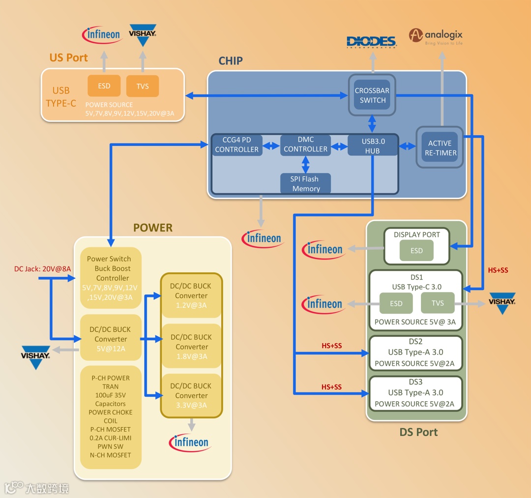 CHIP:Dock Manager Controller让Dock支持从Win OS透过USB更新FW,CCG4 PD负责PD协议交握及沟通及Buck-Boost Charger IC控制,完成影像及USB数据传输, USB3.0 HUB 支持4 port USB 3.0- DS ports。