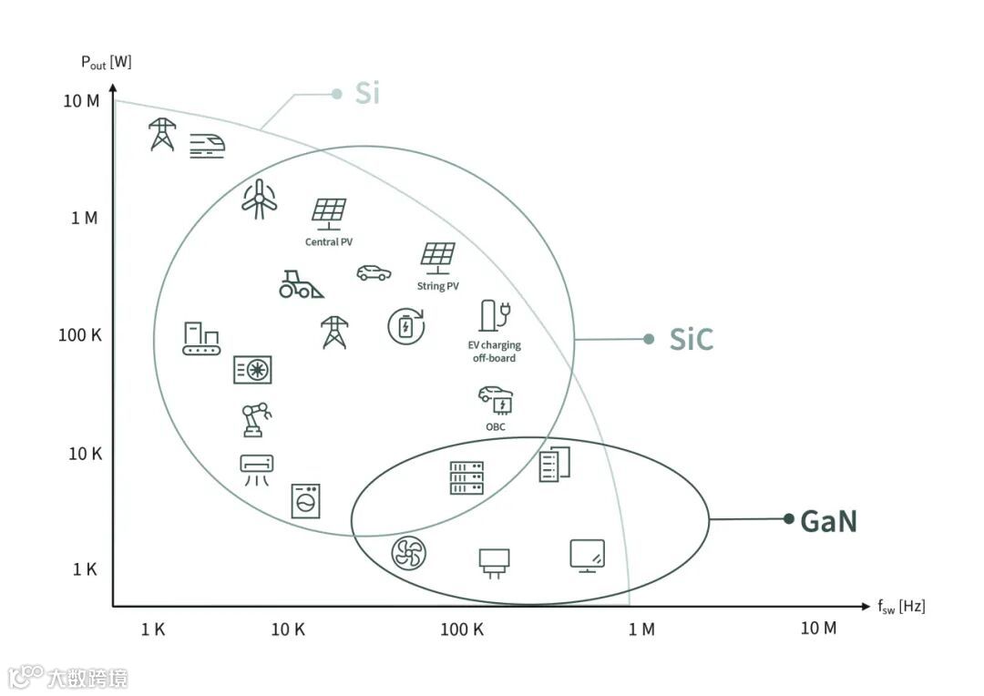 图4展示了硅、SiC和GaN这三种功率半导体技术的共存关系。尽管硅基技术仍是众多应用的主流选择,但SiC技术在需要使用400V-3.3kV器件的诸多应用中,与前者互为补充,能够提供更好的散热性能、更高的可靠性和更为紧凑的解决方案。GaN技术在40V-750V的低压范围内,与硅基技术竞争激烈,特别是在高开关频率和较低的功率下,优势更为明显。