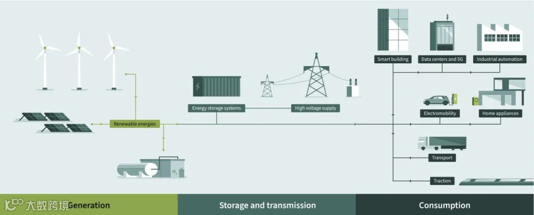 为了实现这些目标,我们必须找到解决方案,以便在电力全链条(发电、输电、储电和用电)的各个环节实现更智能、更高效的能源管理。而功率半导体技术则是这一链条各环节的核心所在。