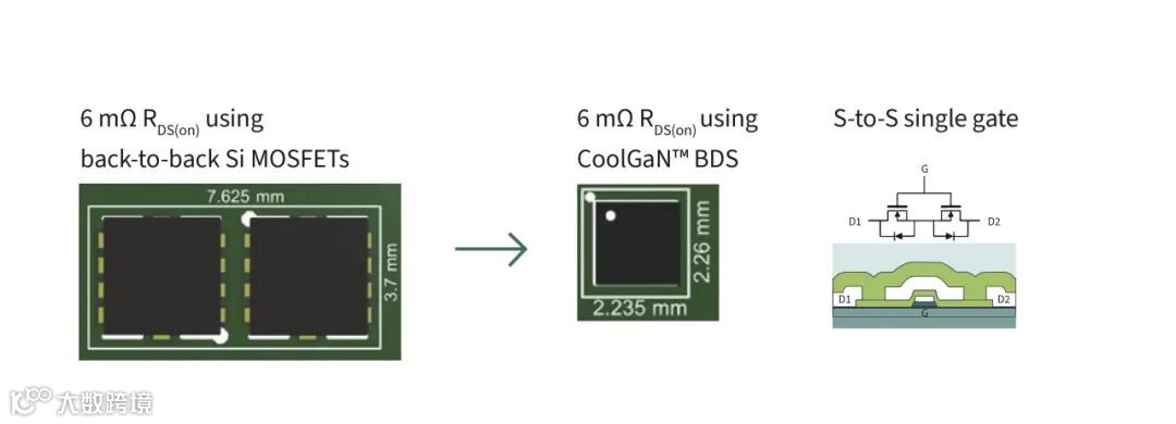 图6:CoolGaN™ BDS与背对背硅基MOSFET相比更节省空间