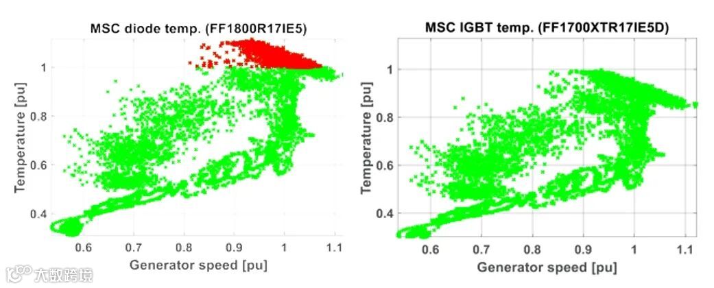 关于FF2000XTR17IE5和FF1700XTR17IE5D的性能优势,我们目前仅从单一稳定工作点进行了考量。实际上,如文献[4]所述,考虑了由风速和电网需求共同决定的现场工作点,由此得出了针对不同发电机转速下LSC和MSC的一系列变流器电流组合。这些不同的工作条件导致不同的结温 Tvj,max。图5和图6显示了两个专用模块如何大大扩展了运行范围。由于LSC IGBT的最大温度相比标准模块减少了25%,MSC二极管的温度下降了13%,从而实现了改进。