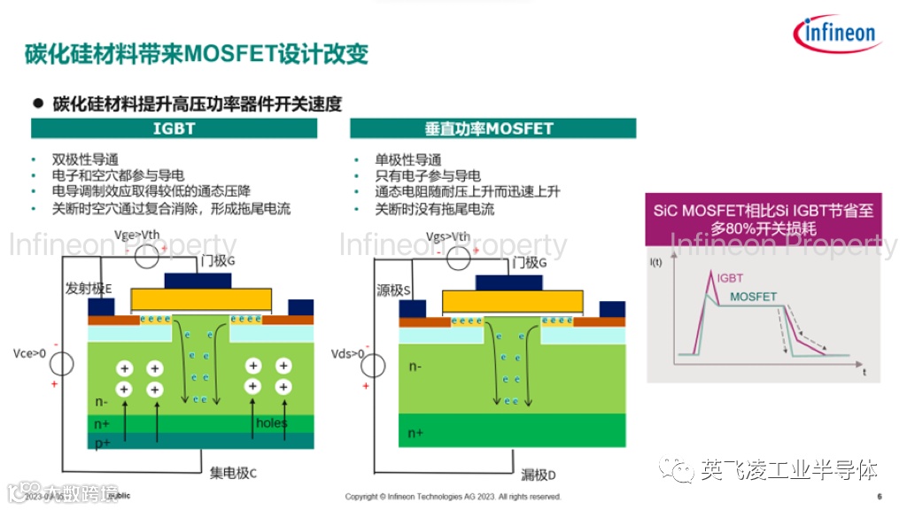 (b) IGBT是双极性器件,电子和空穴同时参与导电,关断时空穴复合产生拖尾电流,增加了关断损耗。而SiC MOSFET是单极性器件,没有拖尾电流,相比Si IGBT节省至多80%开关损耗。SiC材料大大拓展了MOSFET的电压等级,最高电压可到3300V以上,重新定义了MOSFET的应用范围。