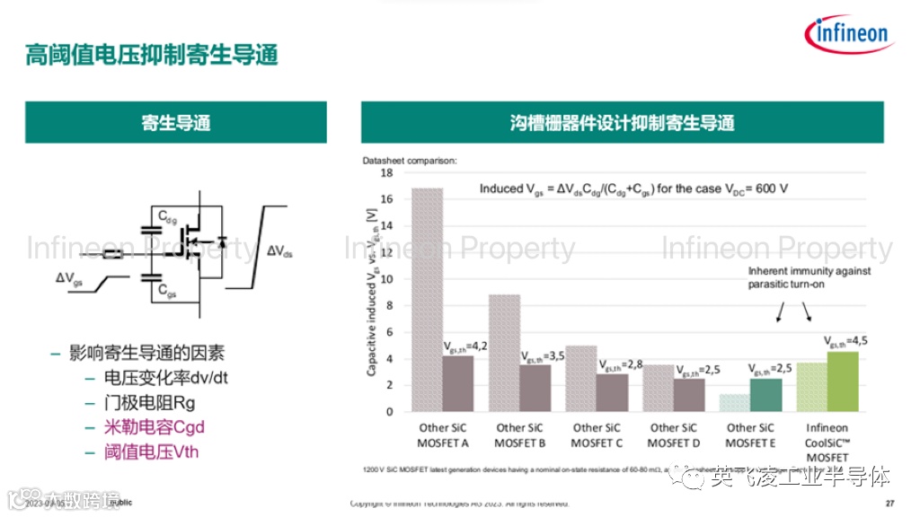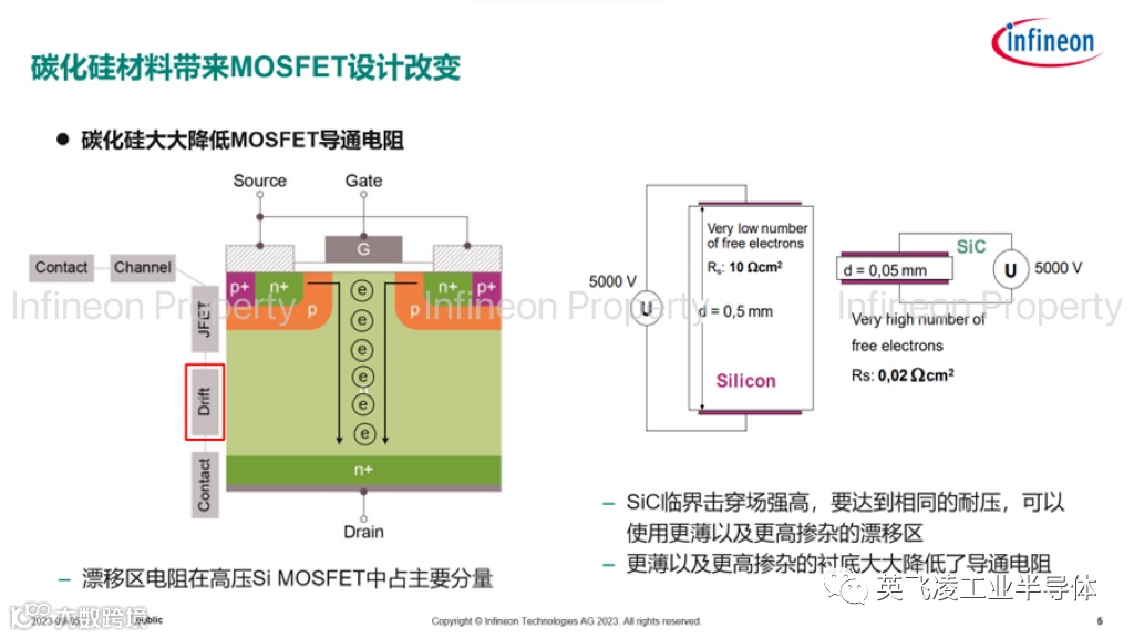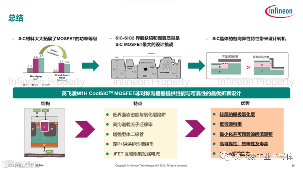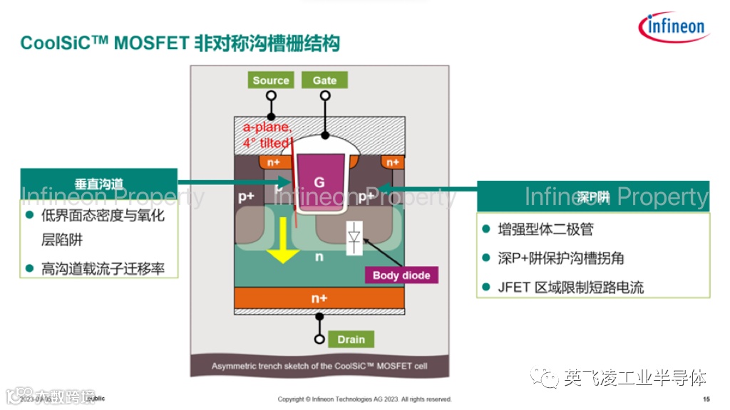 (e) 英飞凌CoolSiC™ MOSFET采用非对称沟槽栅结构,有如下技术点: