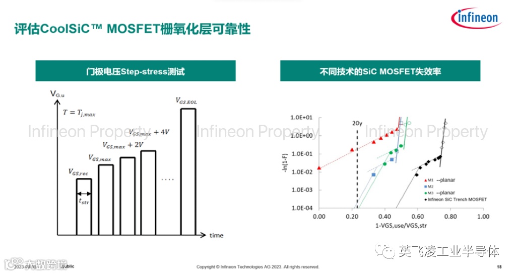 (a) 英飞凌SiC MOSFET栅氧化层厚度与Si 器件栅氧化层厚度相当。而平面型SiC MOSFET 栅氧化层厚度普遍低于沟槽栅。栅氧化层的电压应力与厚度成反比,过高的电场应力使得器件经时击穿的风险增加。可通过施加门极阶跃电压的方式来评估栅氧化层可靠性。英飞凌CoolSiC™ MOSFET拥有最低的失效率,并且与Si IGBT的失效特性相似。