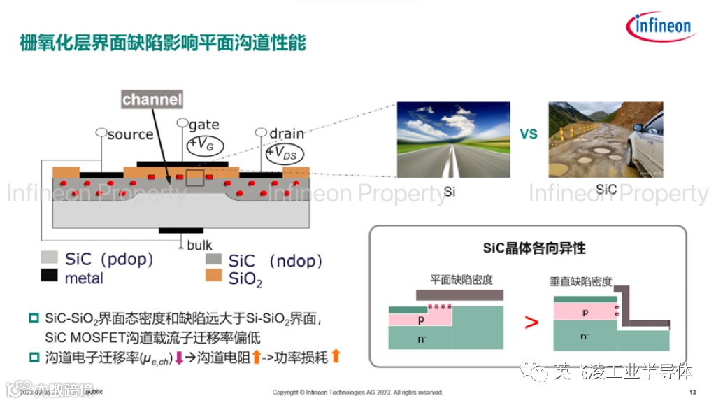 (c) SiC-SiO2界面态密度和缺陷远大于Si-SiO2界面,SiC MOSFET沟道载流子迁移率相比IGBT偏低。沟道载流子迁移率低会导致沟道电阻和损耗上升。SiC是各向异性晶体,垂直晶面上的氧化层缺陷密度小于水平晶面。可以利用这一特性解决上述难题。