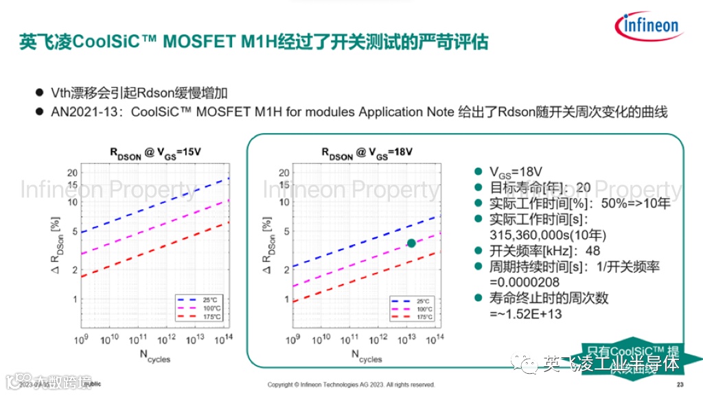 (b) 在长期的开关过程中,SiC MOSFET会出现阈值漂移的现象。这是平面型器件与沟槽型器件都需要共同面对的难题。英飞凌最早发现并研究了这一现象。最新的M1H芯片,进一步改善了栅氧化层质量,使得阈值漂移可以忽略不计。当到达预期目标寿命时,导通电压为18V时,预计25°C时的RDS(on)的相对变化小于6%,175°C时小于3%。