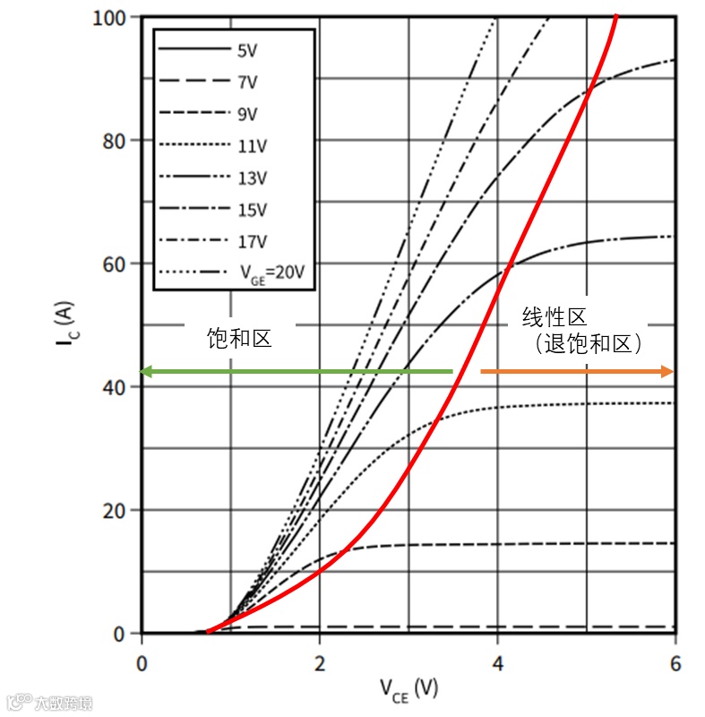 功率器件正常工作时处于饱和区,CE电压很低,此时器件电流随CE电压提高而上升。随着CE电压进一步提升,反型层沟道被夹断,器件电流相对保持稳定,不再随CE电压上升而上升,我们称之为退出饱和区。在IGBT的输出特性曲线上,我们能看到明显的退饱和现象。(关于IGBT退饱和特性更详细分析可参考如何理解IGBT的退饱和现象以及安全工作区)