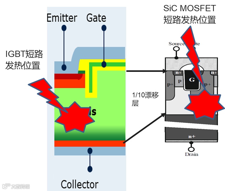 当功率器件短路时,器件承受母线电压,电场分布在整个漂移区。因为SiC材料的临界电场强度约是Si材料的10倍,因此,要达到同样的耐压等级,SiC MOSFETI漂移区仅需要Si IGBT的十分之一。这意味着SiC MOSFET短路时发热热量更集中,温度也更高。
