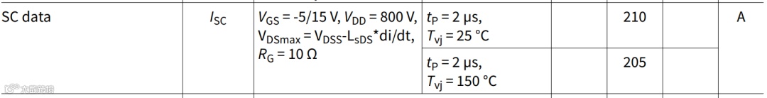 而大部分的SiC MOSFET都没有标出短路能力,即使有,也比较短,例如英飞凌的CoolSiCTM MOSFET单管封装器件标称短路时间是3us,EASY封装器件标称短路时间是2us。