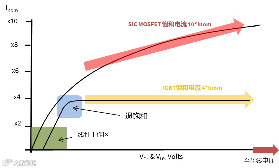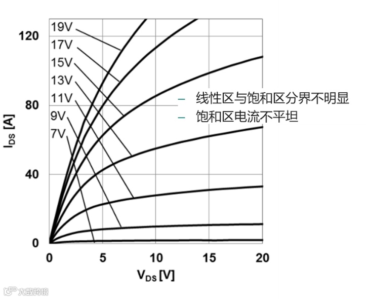 有的SiC MOSFET没有短路能力,是因为它没有退饱和特性吗?非也,SiC MOSFET也有退饱和特性,只不过对于MOSFET,工作区的命名方式和IGBT正好相反,正常工作的状态为线性区。当DS之间电压上升到一定程度后,沟道夹断,电流随DS电压上升的趋势变小,这时MOSFET进入了饱和区。只不过从输出特性上看,对于SiC MOSFET,进入饱和的拐点不太明显。SiC MOSFET进入饱和区的拐点不太明显,和DIBL(漏致势垒降低效应)有关,有兴趣了解的读者请戳这篇文章SiC MOSFET的短沟道效应。