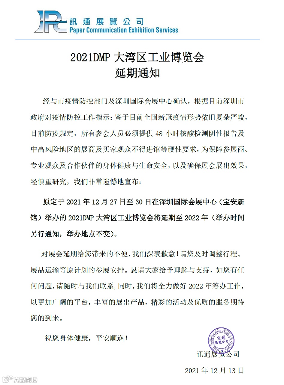 原定于 2021 年 12 月 27 日至 30 日在深圳国际会展中心(宝安新馆)举办的 2021DMP 大湾区工业博览会将延期至 2022 年(举办时间 另行通知,举办地点不变)。