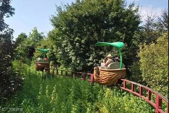 最惊险的要数下面这个“一片叶子”过山车。坐上它,你将顺着轨道往前,高高低低,在树林间穿梭。要当心树枝碰到脸哦。