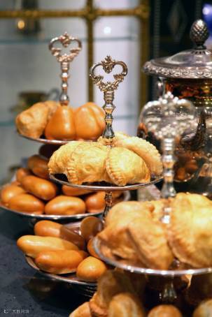 就像往常一样,每一个树形陈列台的分支上上面是甜食,下面是法式糕点,不要忘了中部摆着烤点。