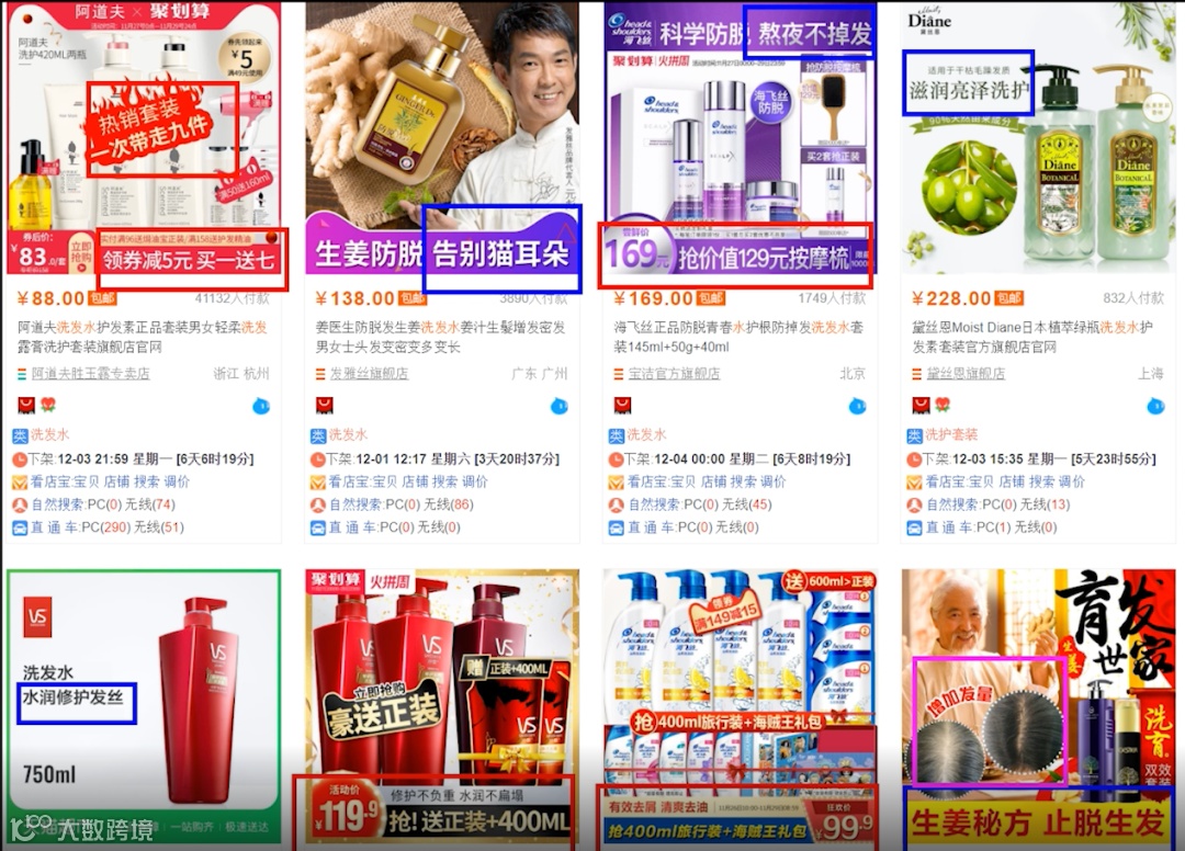 在图片上,我们还可以看到用紫色框标示出来的,是一个使用前后的对比的结果,针对脱发以及发量少的人群,展现出他们所向往的画面,最终达到提升点击率的效果。