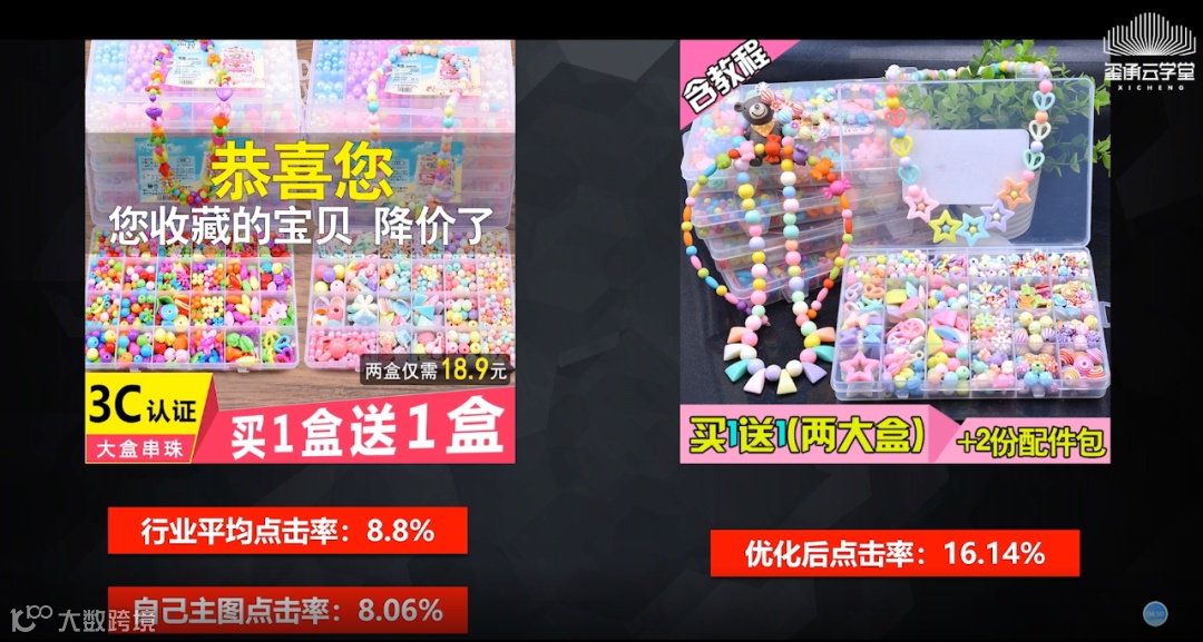 这是一个儿童串珠,原先行业平均值为8.8%,主图的点击率是8.06%,还没有达到了行业平均值,通过优化过后,图片的点击率变成了16.14%。对比两张图来看,优化后的图片,最大的变化是站在了买家的需求点上制定主图。