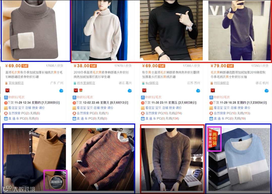 这是一个男士毛衣的搜索结果,一种是红色框的模特展示,一种是蓝色框的静物展示。还有两个紫色框标示出来的是产品卖点,这是区别于其他产品特性的一个卖点。