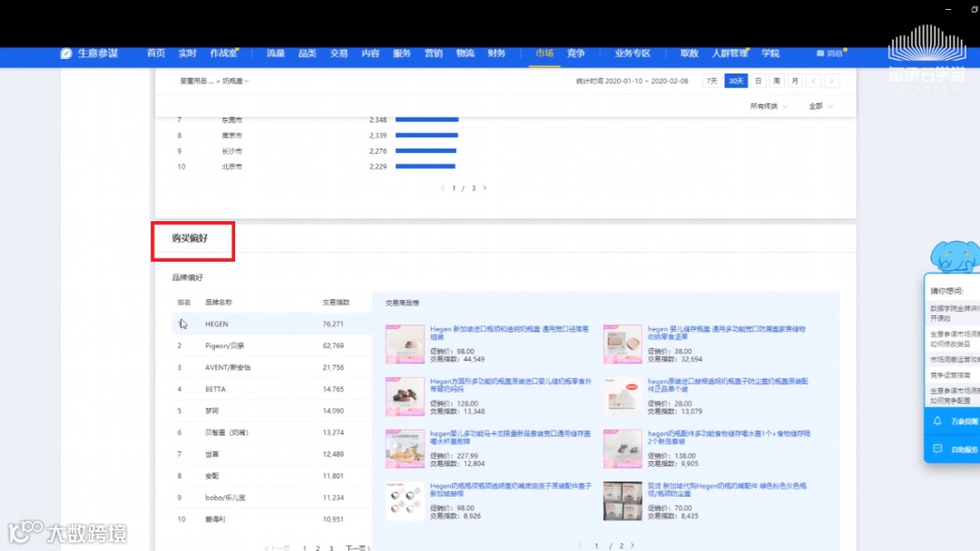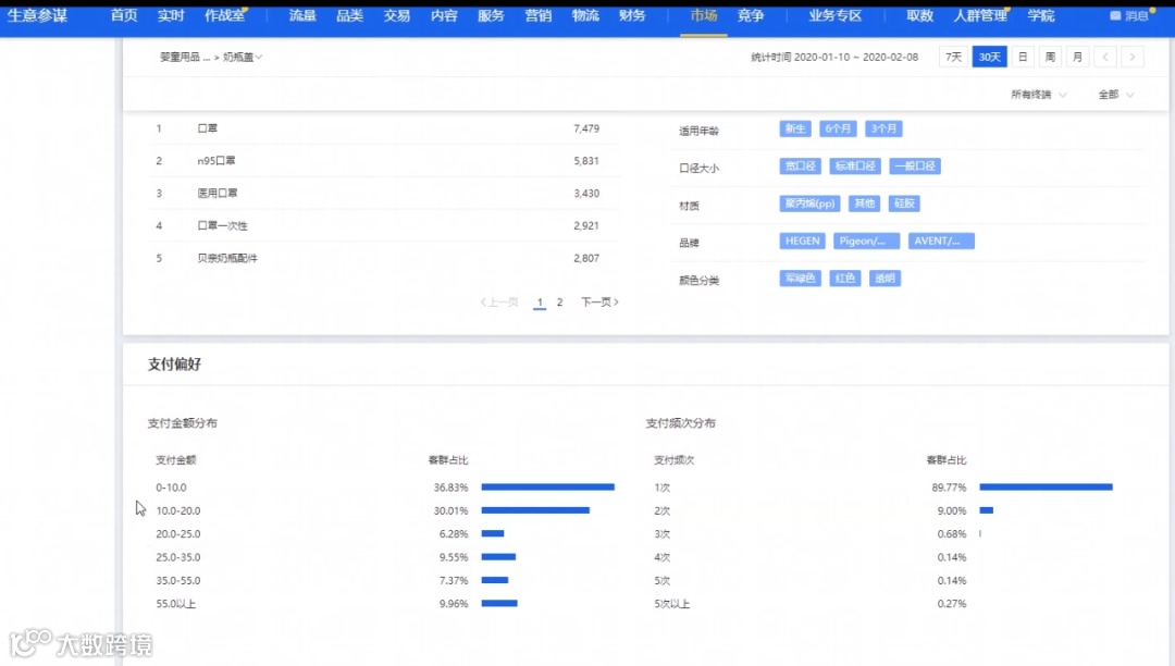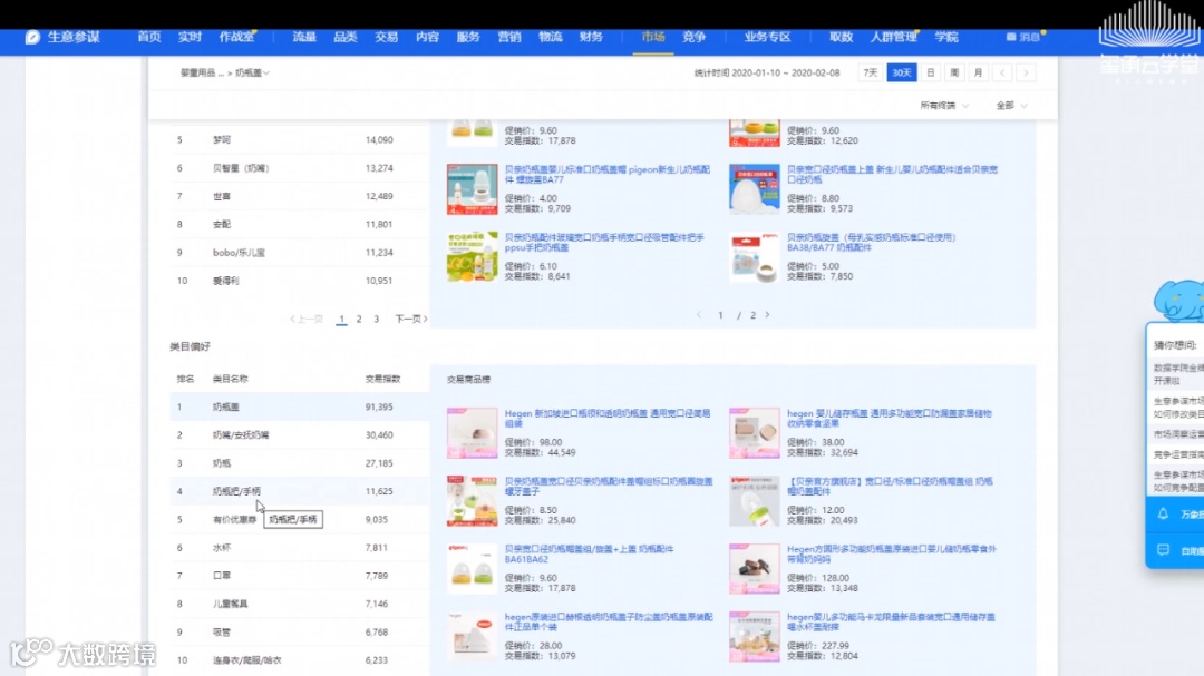 这里展示的是跟奶瓶盖类目关联性比较强的几个类目的交易指数排行,以及每个类目下的交易商品榜单。