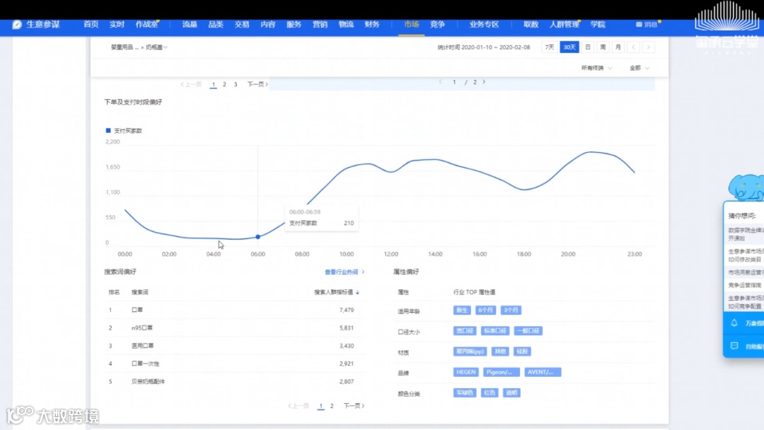 在生意参谋市场模块下的左边有一个行业客群,点进去之后可以看到在页面的右上角是时间的选项,行业客群时间上可以选最近一天,最近7天,最近30天以及最近一个月。左上角有个类目选择,我们以婴童类目来举例: