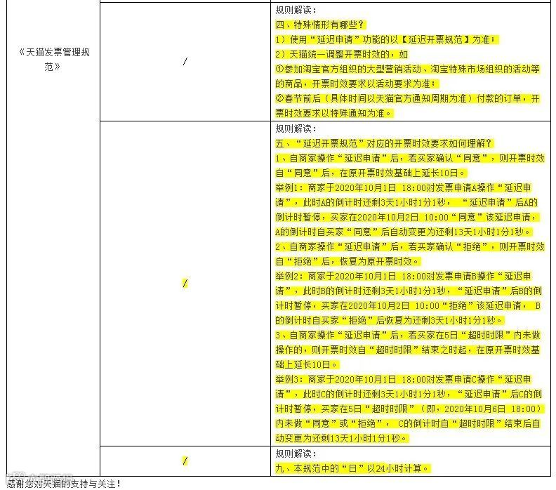 此外,买家在线确认开票后,商家若因客观原因确实无法在上述开票时效内完成开票的,应先保留客观原因凭证,并通过阿里发票平台“延迟申请”功能与买家协商处理,自商家发起“延迟申请”之时起赔付倒计时暂停,开票时效要求以最终协商结果为准。