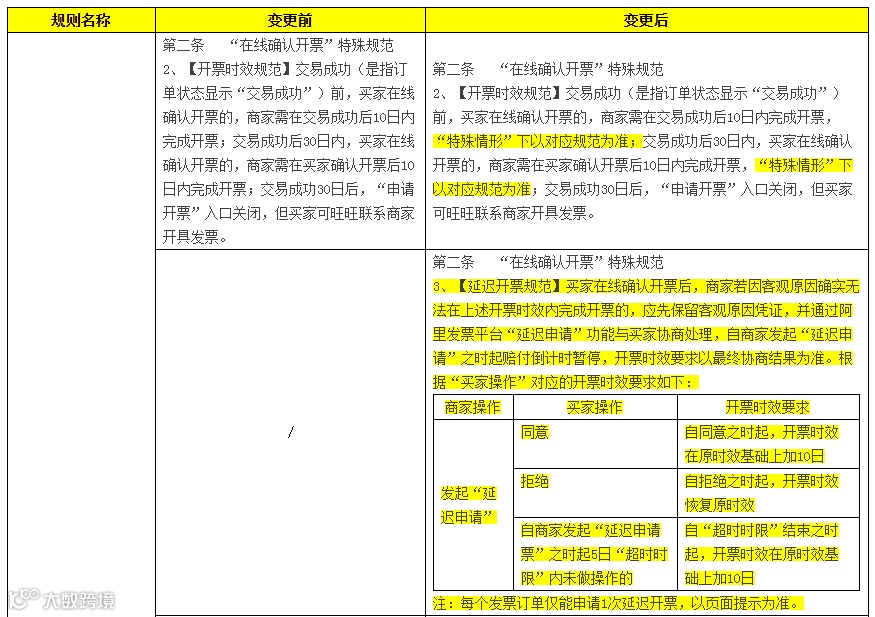 交易成功(是指订单状态显示“交易成功”)前,买家在线确认开票的,商家需在交易成功后10日内完成开票,“特殊情形”下以对应规范为准;