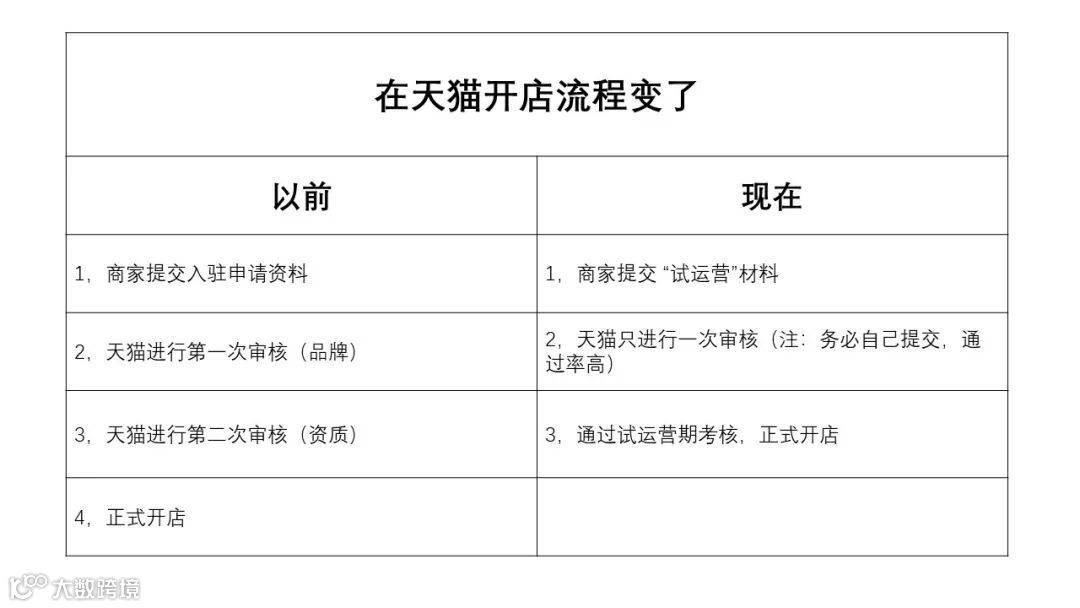 也就是说,以后,申请来天猫开店的商家,资质审核将简化,而以商家的实际运营能力作为商家开天猫店的标准。通过7个月的试运营能力考核之后,就会成为正式天猫店。