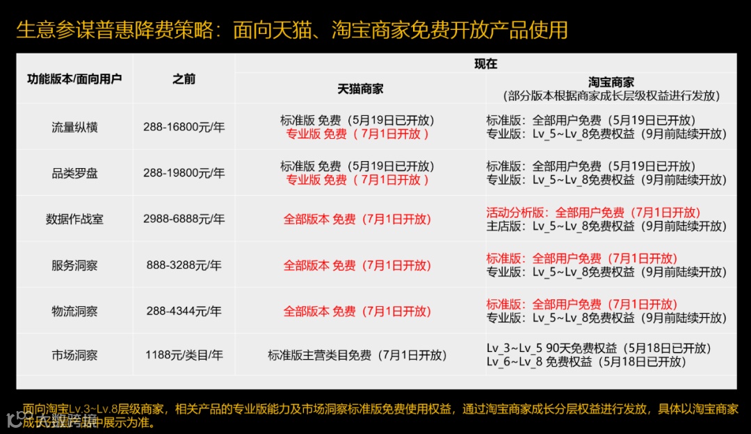 面向天猫商家:免费开放流量纵横、品类罗盘、数据作战室、服务洞察、物流洞察的专业版,以及主营类目的市场洞察标准版。