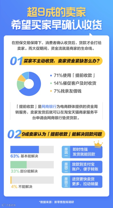 “通过提前收款,在担保交易模式保护消费者权益的前提下,卖家不用等买家确认收货,发货后就能申请由网商银行垫资货款” ,网商银行场景金融负责人张成柱表示,“大促期间,资金流就是商家的生命线,整月免费举措是为了帮助他们无成本快速循环资金,便于扩大再生产”。