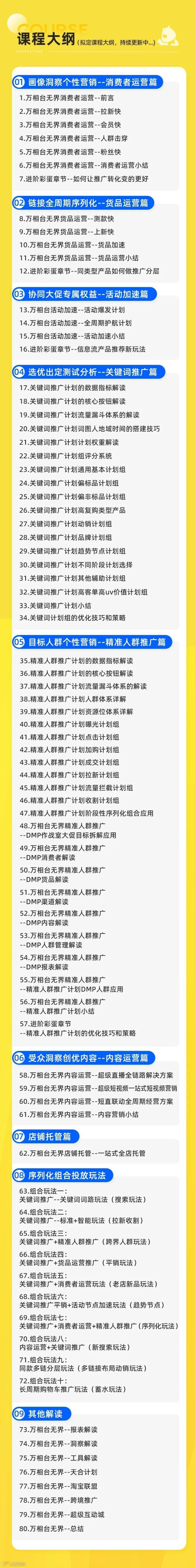 这套无界进阶80讲,为什么说超值?因为它是围绕万相台无界推广工具的7个关键营销场景,输出的80节系列化万相台无界全系实操课程!