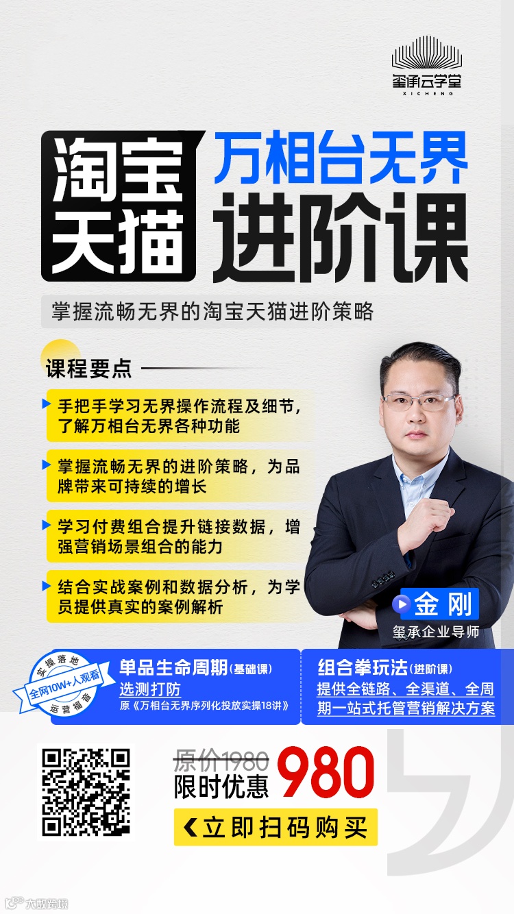 这一次,玺承云学堂邀请金刚老师为大家带来了详细的【万相台无界进阶课80讲】,围绕万相台无界推广工具的7个关键营销场景,输出的80节系列化万相台无界全系实操课程!
