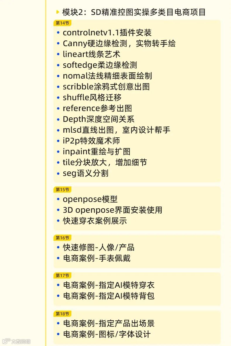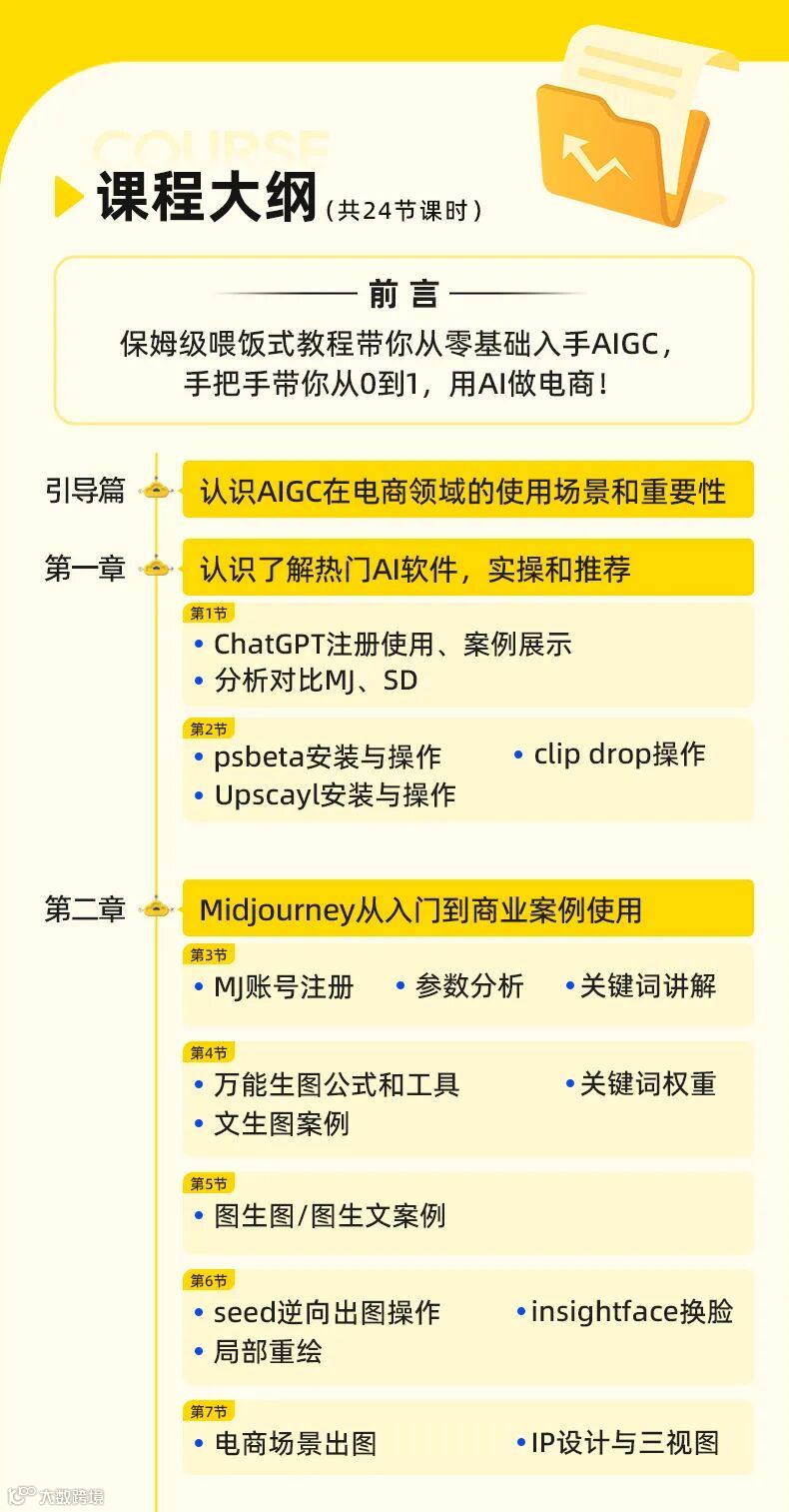 这一套课程,通过4大章节,24个课时,72个干货知识点,多类目电商案例实操,超过8个小时,从0-1全流程后台操作演示,可以说是保姆级喂饭式AIGC实操教程。