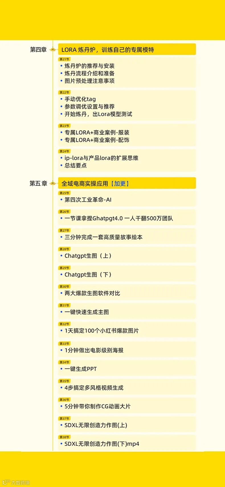 这一套课程,通过5大章节,38个课时,72个干货知识点,10+个多类目电商案例实操,14个全域电商实操案例,近10小时课程,从0-1全流程后台操作演示,可以说是保姆级喂饭式AIGC实操教程。