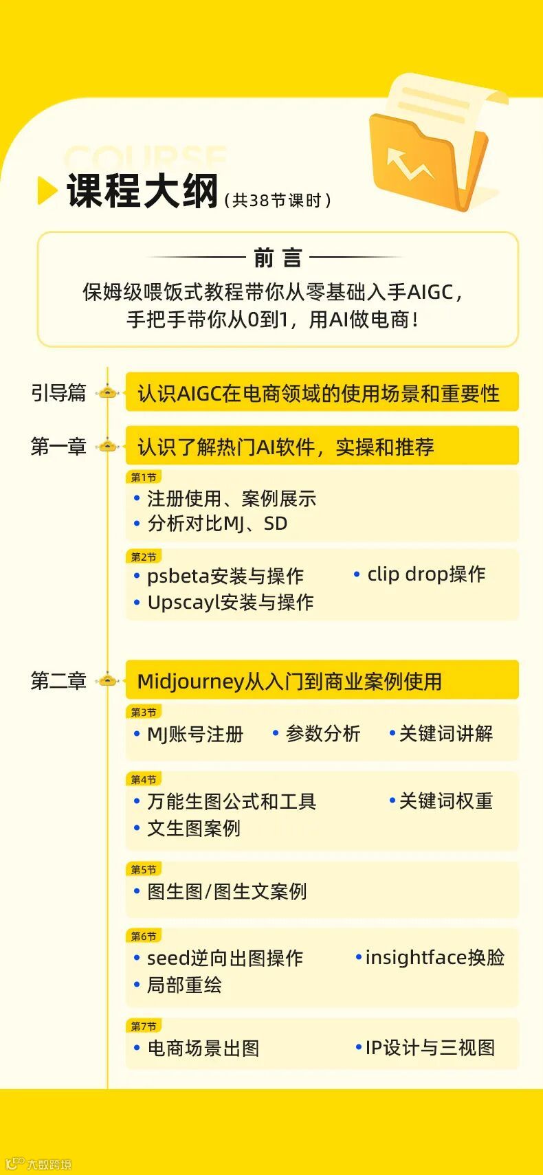 这一套课程,通过5大章节,38个课时,72个干货知识点,10+个多类目电商案例实操,14个全域电商实操案例,近10小时课程,从0-1全流程后台操作演示,可以说是保姆级喂饭式AIGC实操教程。