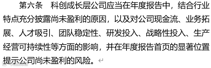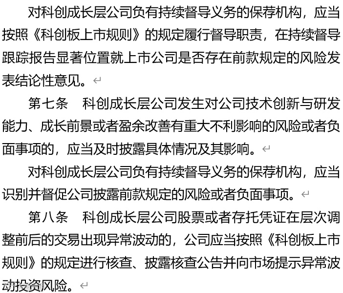三是强化风险导向信息披露。《科创成长层指引》已经就科创成长层企业在年度报告、临时公告中充分披露未盈利风险、技术研发风险等作了具体规定,并要求持续督导机构切实履行职责。上交所将严格执行规则规定,督促科创成长层企业、持续督导机构诚实守信,围绕投资者价值判断和投资决策所需,切实履行信息披露义务。