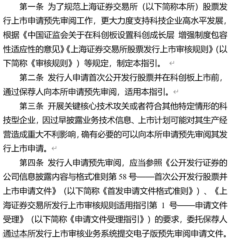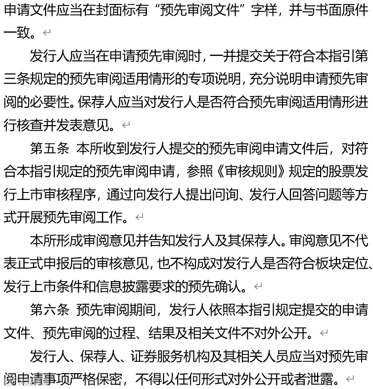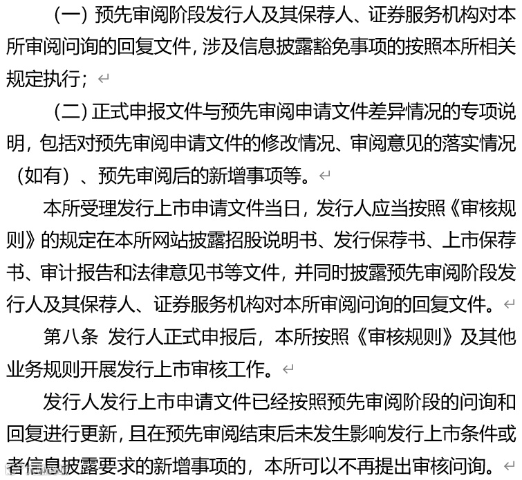 三是规范预先审阅程序。上交所将严格参照正式审核程序开展审阅工作,向发行人和保荐人反馈审阅意见。上交所的审阅意见不构成对发行人是否符合板块定位、发行上市条件和信息披露要求的预先确认。通过预先审阅的科技型企业正式提交IPO申报的,上交所将落实《科创板意见》的要求加快推进审核程序。