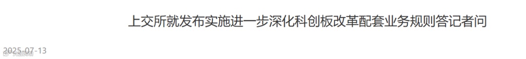 7月13日,上交所发布《科创板上市公司自律监管指引第5号——科创成长层》等配套业务规则,包括《科创板上市公司自律监管指引第5号——科创成长层》、《发行上市审核规则适用指引第7号——预先审阅》、《发行上市审核规则适用指引第8号——资深专业机构投资者》等3项业务指引,以及修订的《会员管理业务指南第2号——风险揭示书必备条款》和《证券交易业务指南第6号——证券特殊标识》等2项业务指南。这些规则自发布之日起实施。上交所相关负责人就业务规则制定修订情况答记者问。