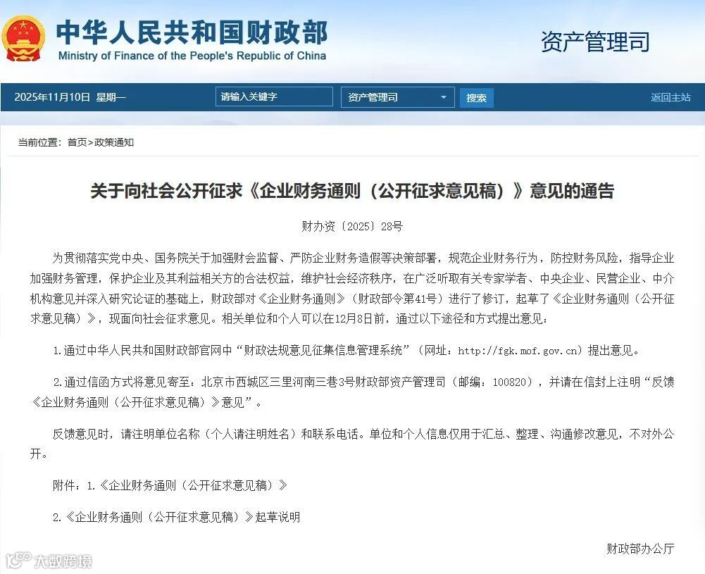 为贯彻落实党中央、国务院关于加强财会监督、严防企业财务造假等决策部署,规范企业财务行为,防控财务风险,指导企业加强财务管理,保护企业及其利益相关方的合法权益,维护社会经济秩序,在广泛听取有关专家学者、中央企业、民营企业、中介机构意见并深入研究论证的基础上,财政部对《企业财务通则》(财政部令第41号)进行了修订,起草了《企业财务通则(公开征求意见稿)》,现面向社会征求意见。相关单位和个人可以在12月8日前,通过以下途径和方式提出意见:
