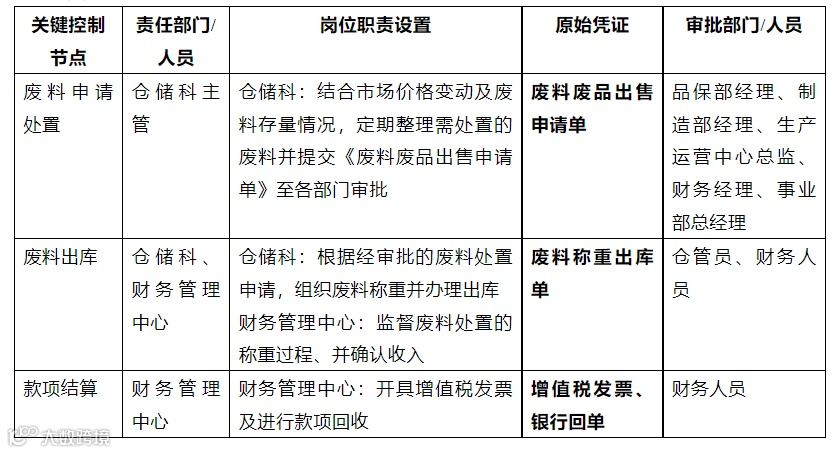 (3)对于废料销售的内部控制,可以列表说明与废料销售相关的原始凭证(废料出售申请单、废料称重出库单、增值税发票和银行回单)、关键控制节点、岗位职责设置以及岗位人员,论述内控有效性。