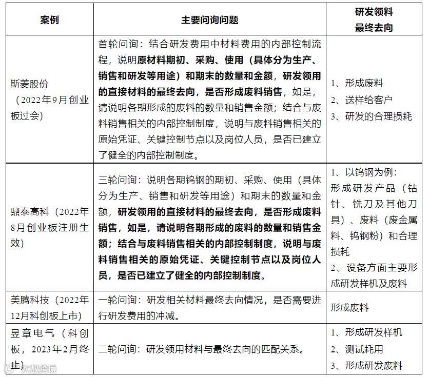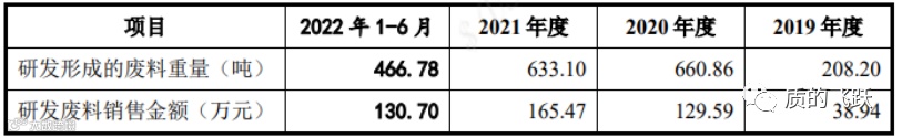 (1)应列表说明废料的重量和销售金额。受废料管理模式影响,若日常管理中未单独区分核算研发废料,参照本文后附案例斯菱股份的做法,可根据研发领料重量及其材料研发废料率(斯菱股份采用研发部门经验值)进行测算,研发废料销售金额也可根据研发废料重量与当期废料平均销售价格计算得出。