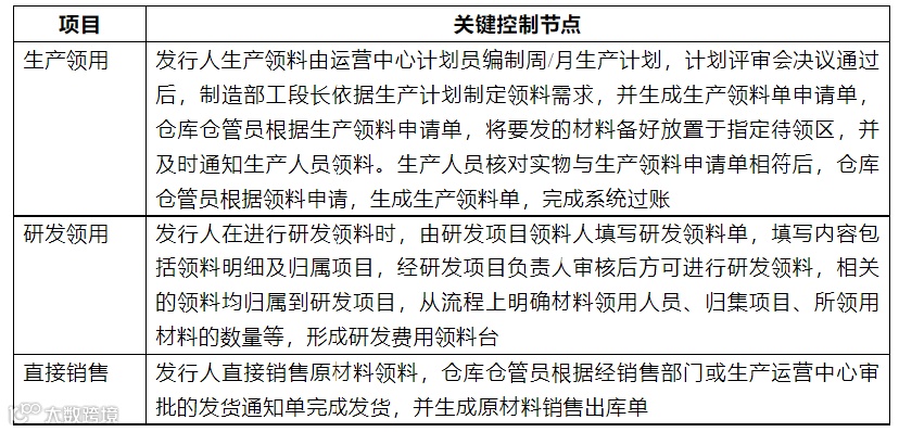 因此,发行人针对在生产领用、研发领用和直接销售等不同用途下的原材料领用制定了差异化的原始凭证或单据、领用及审批流程,相关原始凭证或单据可明确区分,与原材料领用相关的内部控制关键控制节点的设置能够有效防止不同用途下原材料的混用或冒领、代领等情形。