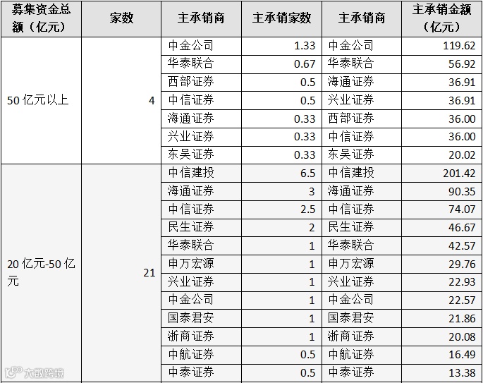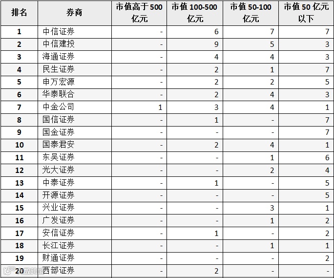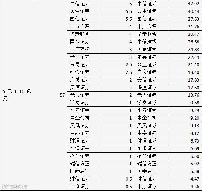不同募集资金金额区间下券商排名如下:
